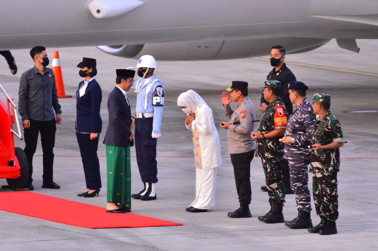 Turut hadir menyambut kedatangan Presiden RI yakni Pangdam V/Brawijaya Mayjen TNI Farid Makruf, Kapolda Jatim Irjen Pol Toni Hermanto, Pangkoarmada II Laksda TNI TSNB Hutabarat, Danlanud Abd Saleh Marsma TNI Zulfahmi, S.Sos., M.Han.